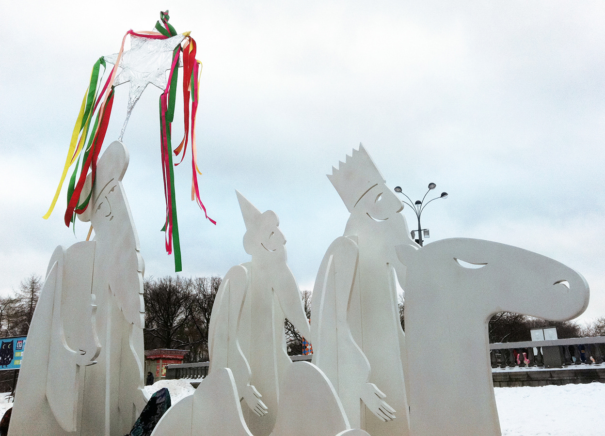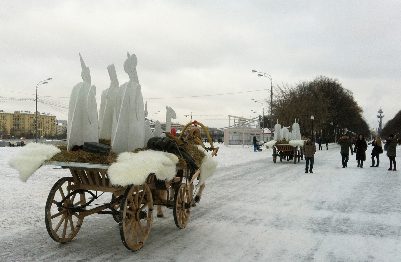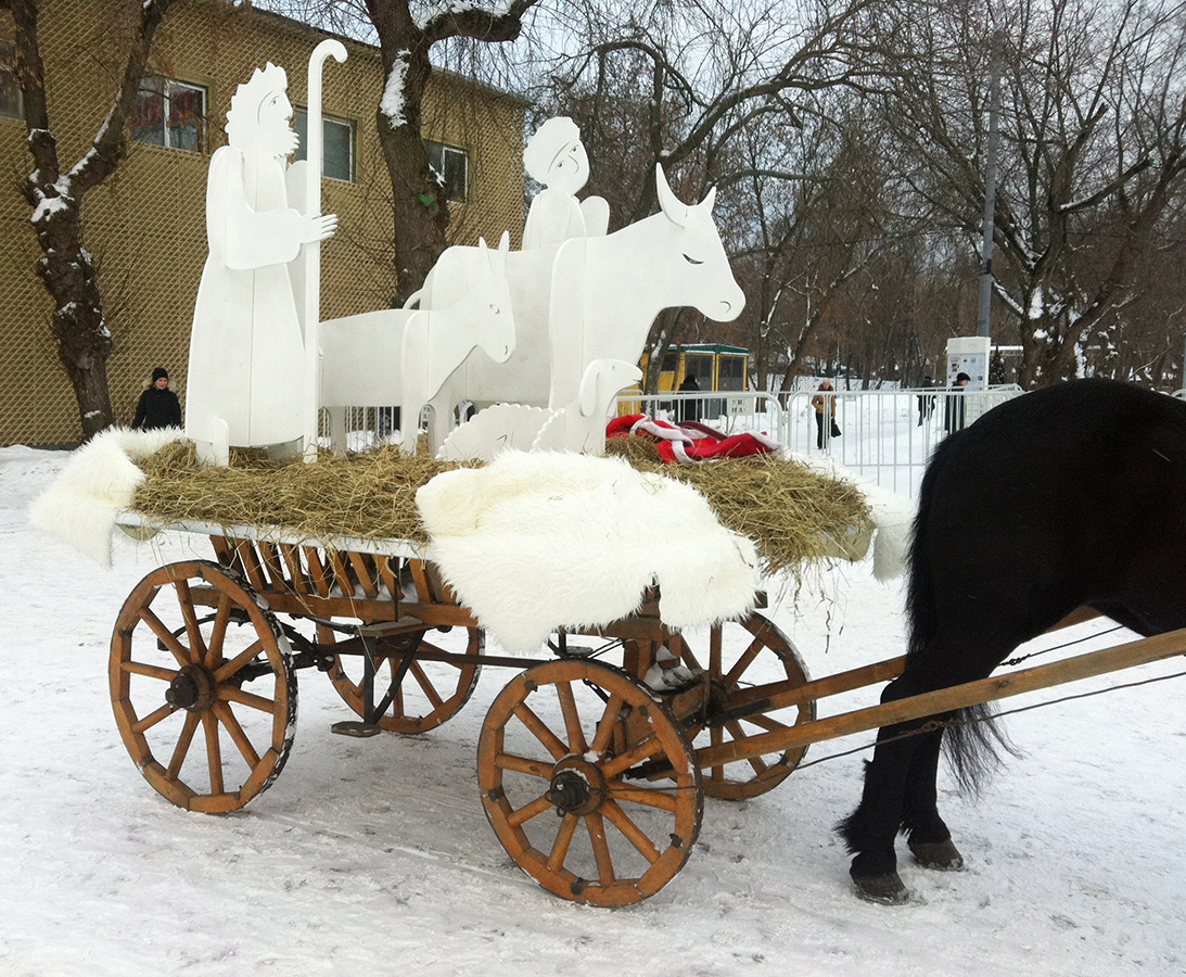 3 wagons drawn by horses and bringing Christmas procession were traveling through the park the whole day on Christmas accompanied by caroling artists singing and dancing Russian folk music.