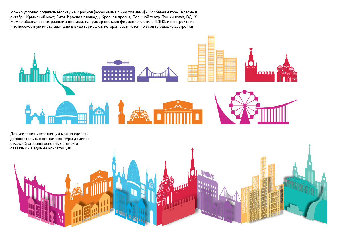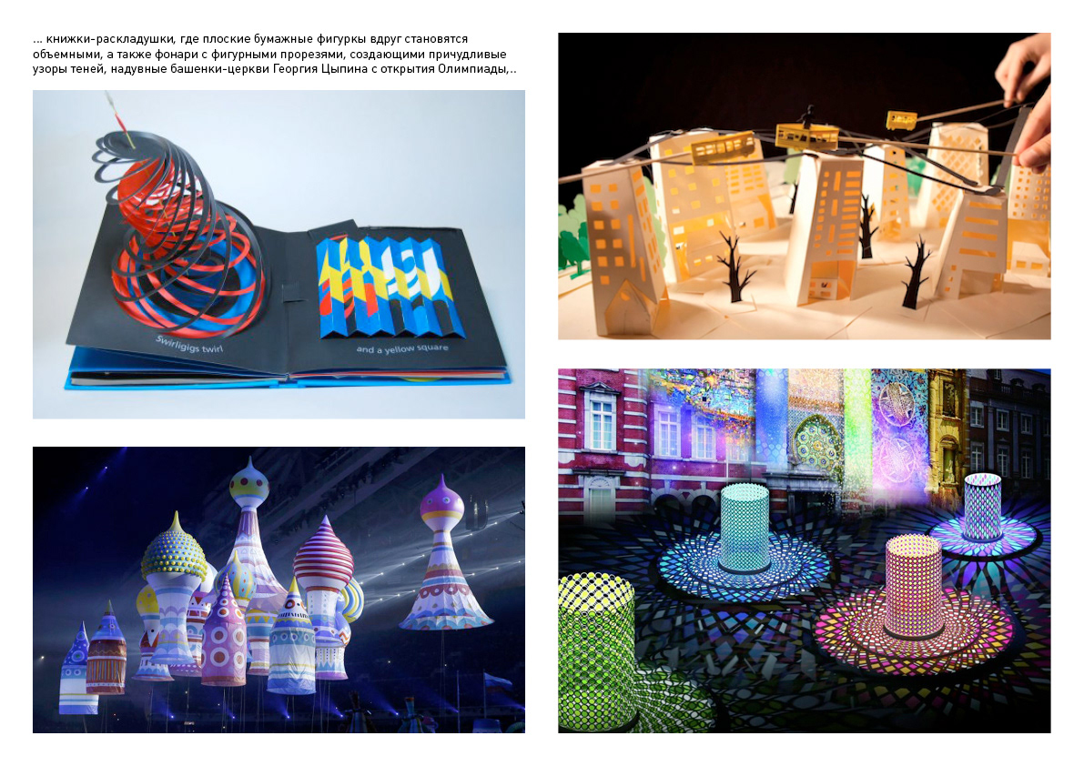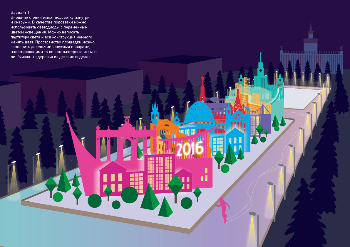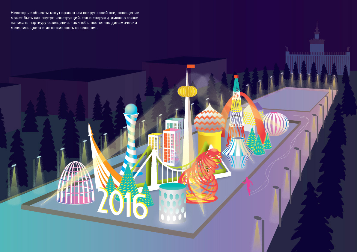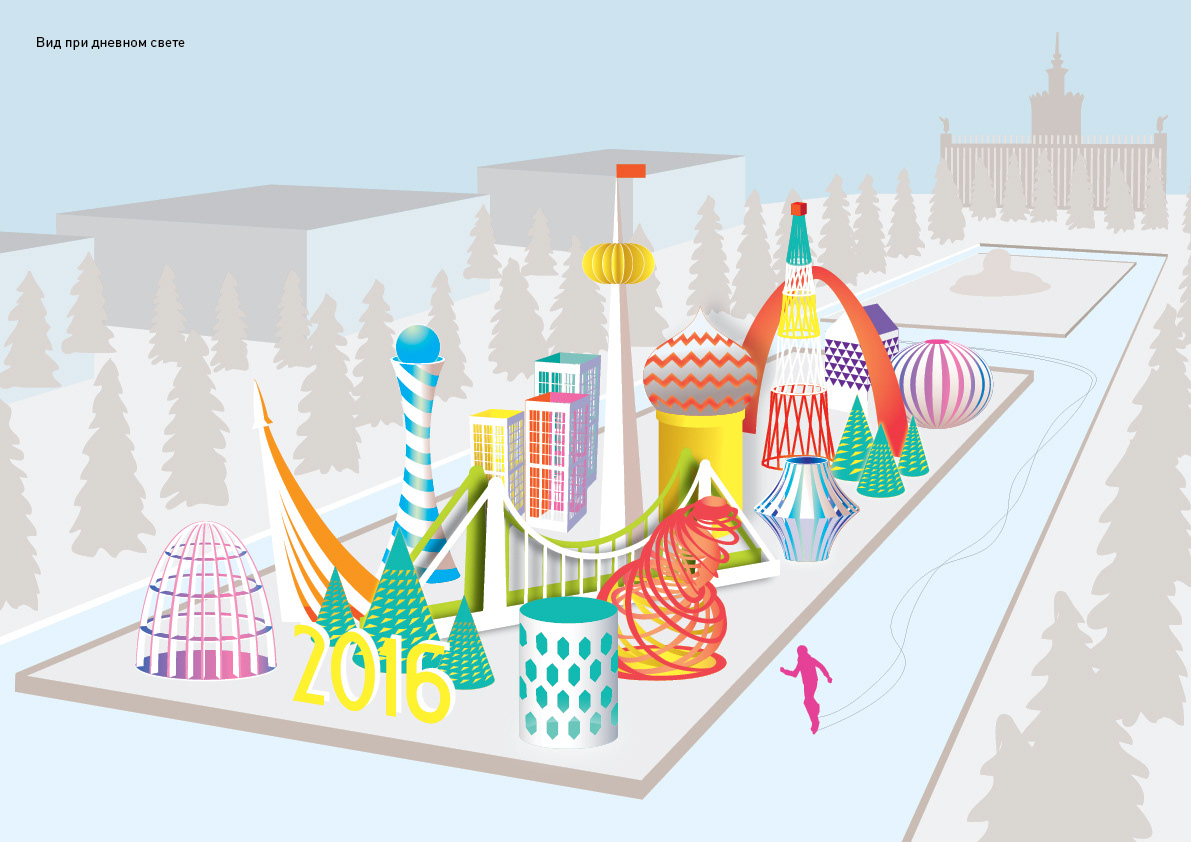 The subject was to create the fairytale city that reminds Moscow turning familiar building into constructions looking like giant papercut christmas lanterns.