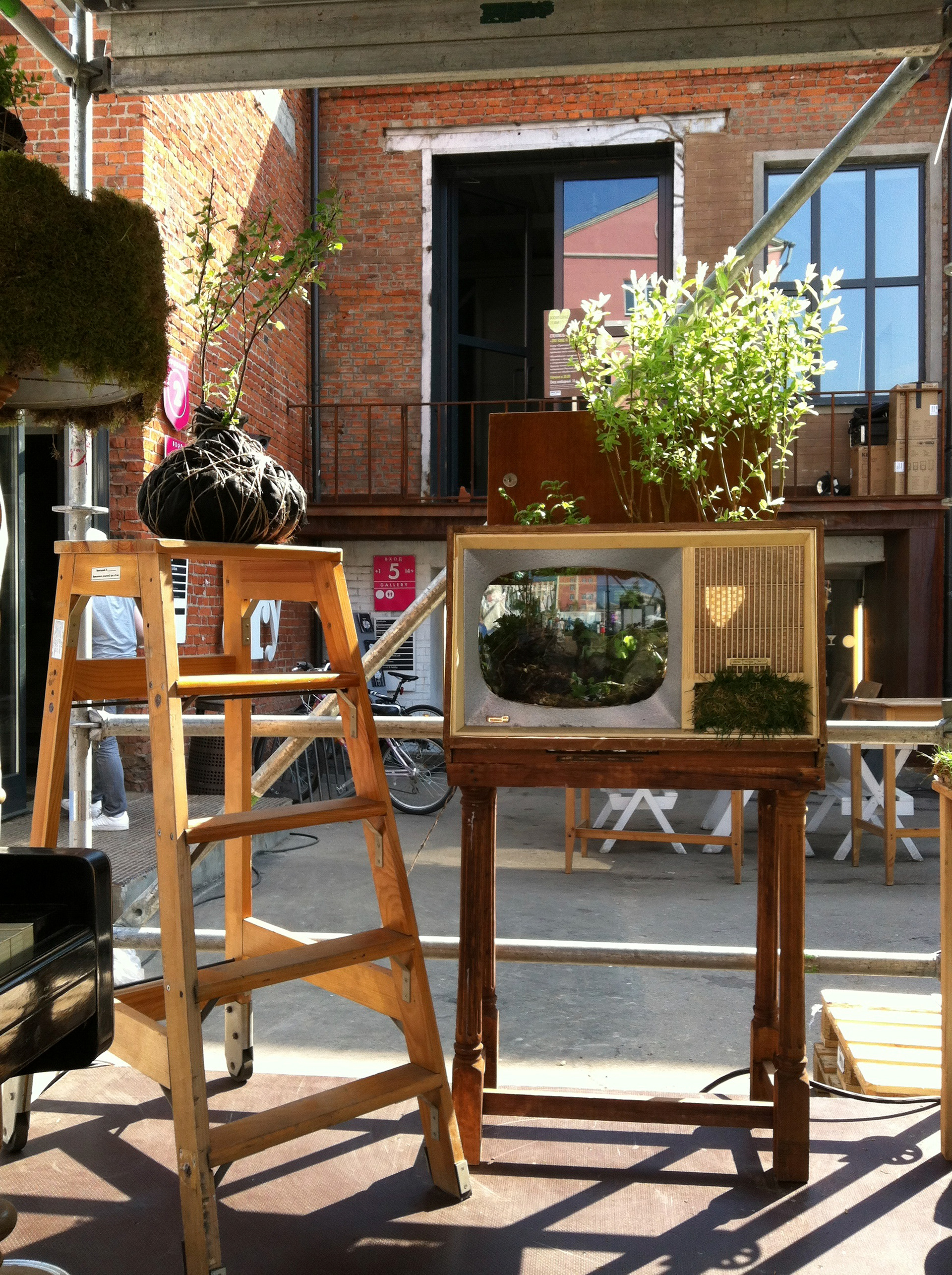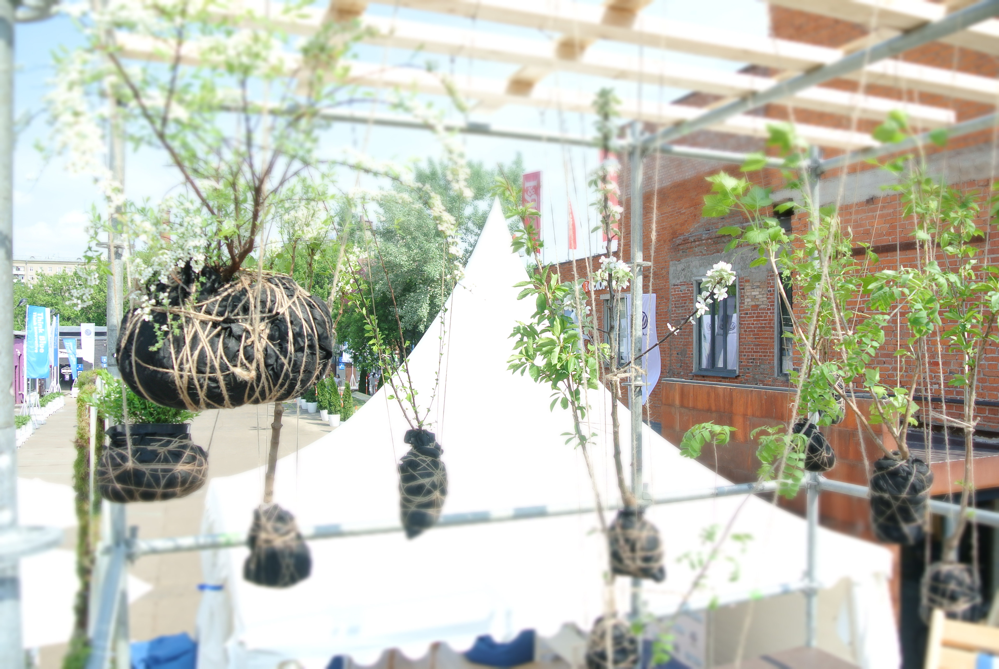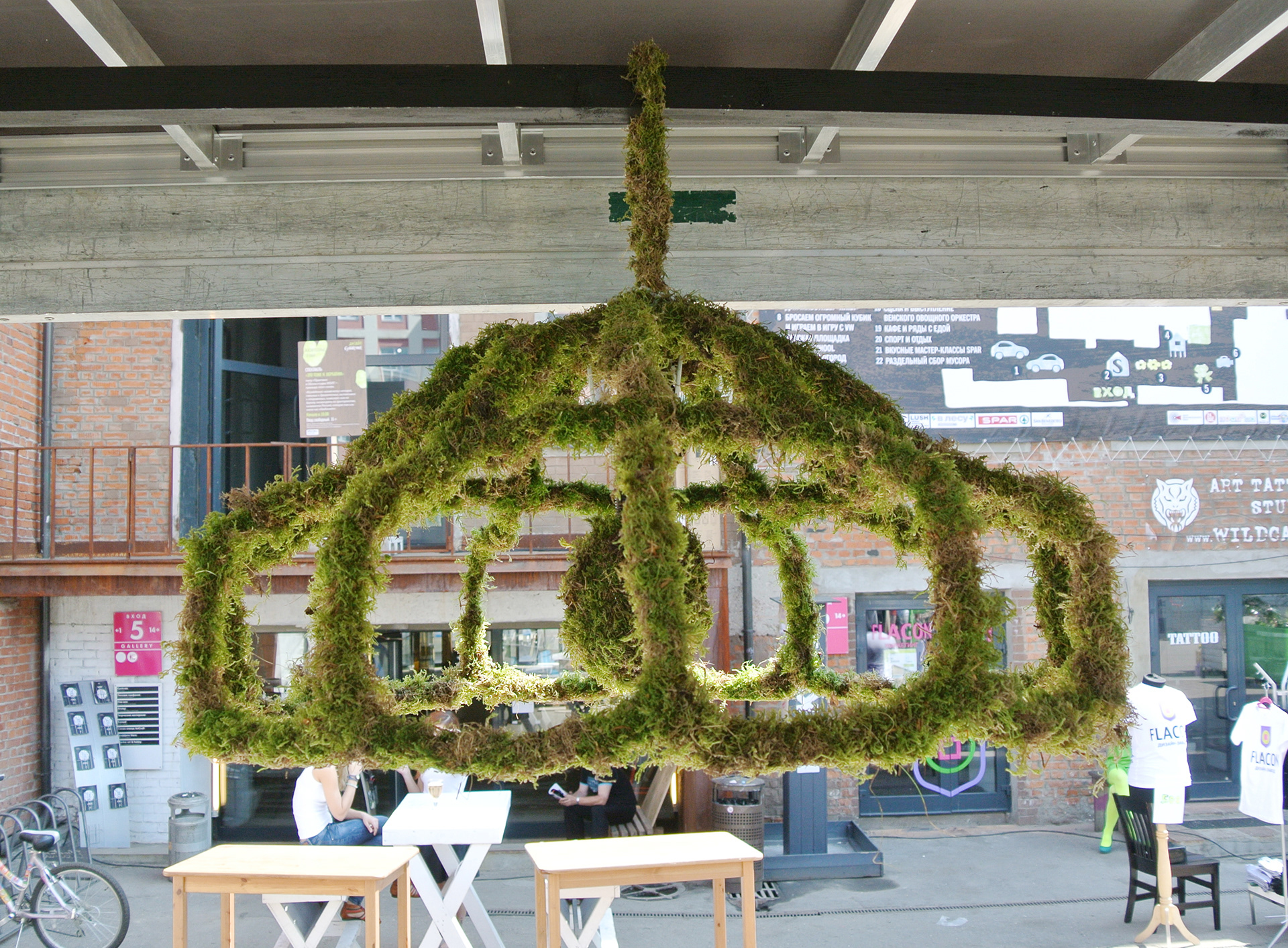 Spring festival Design-subbotnik. Two-level festival headquarters with plants growing through the furniture and all items of the interior. The upper level was developed as a sunbathing area with a little hanging garden.