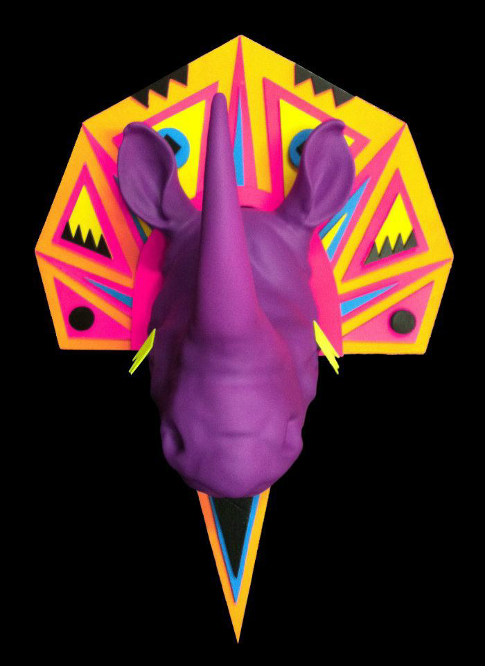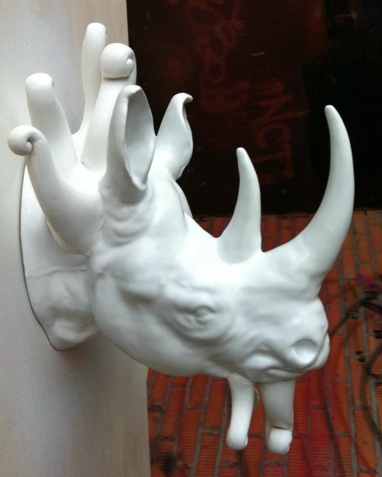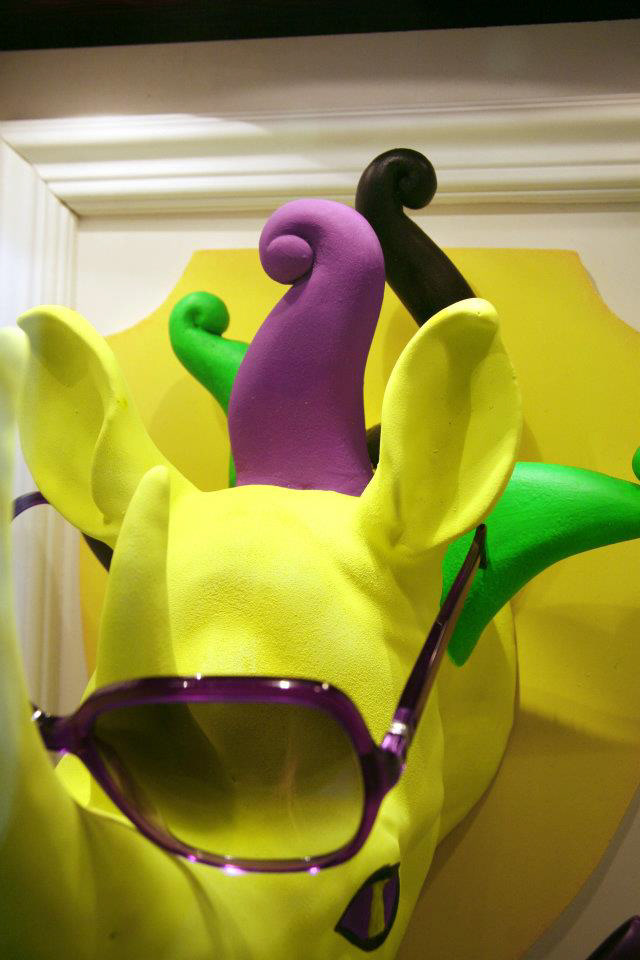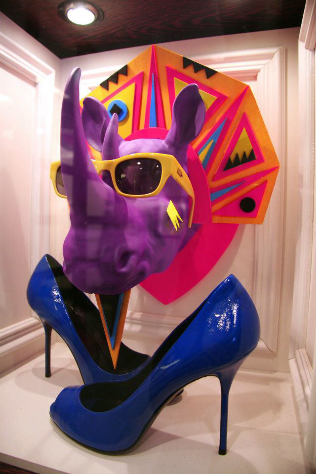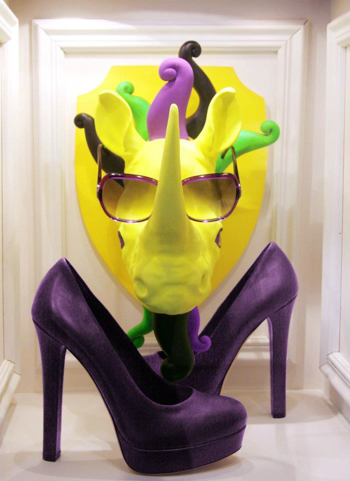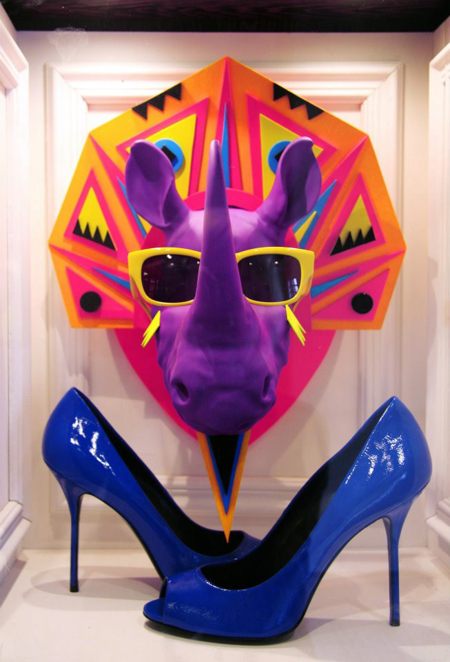TSUM Moscow store windows decoration. Surreal rhinos heads.